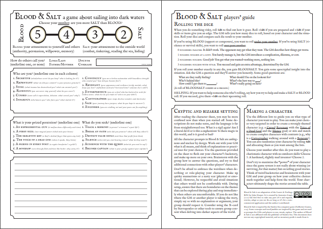 All the character prompts in Blood & Salt are ambiguous and unclear by design. Work out with your GM what it all means, and think of explanations or practical uses for your choices. Use the questions provided on the sheet to flesh out your character’s backstory, and make up more on your own. Brainstorm with the group how to answer the questions, and try to find additional connections with other players’ characters.